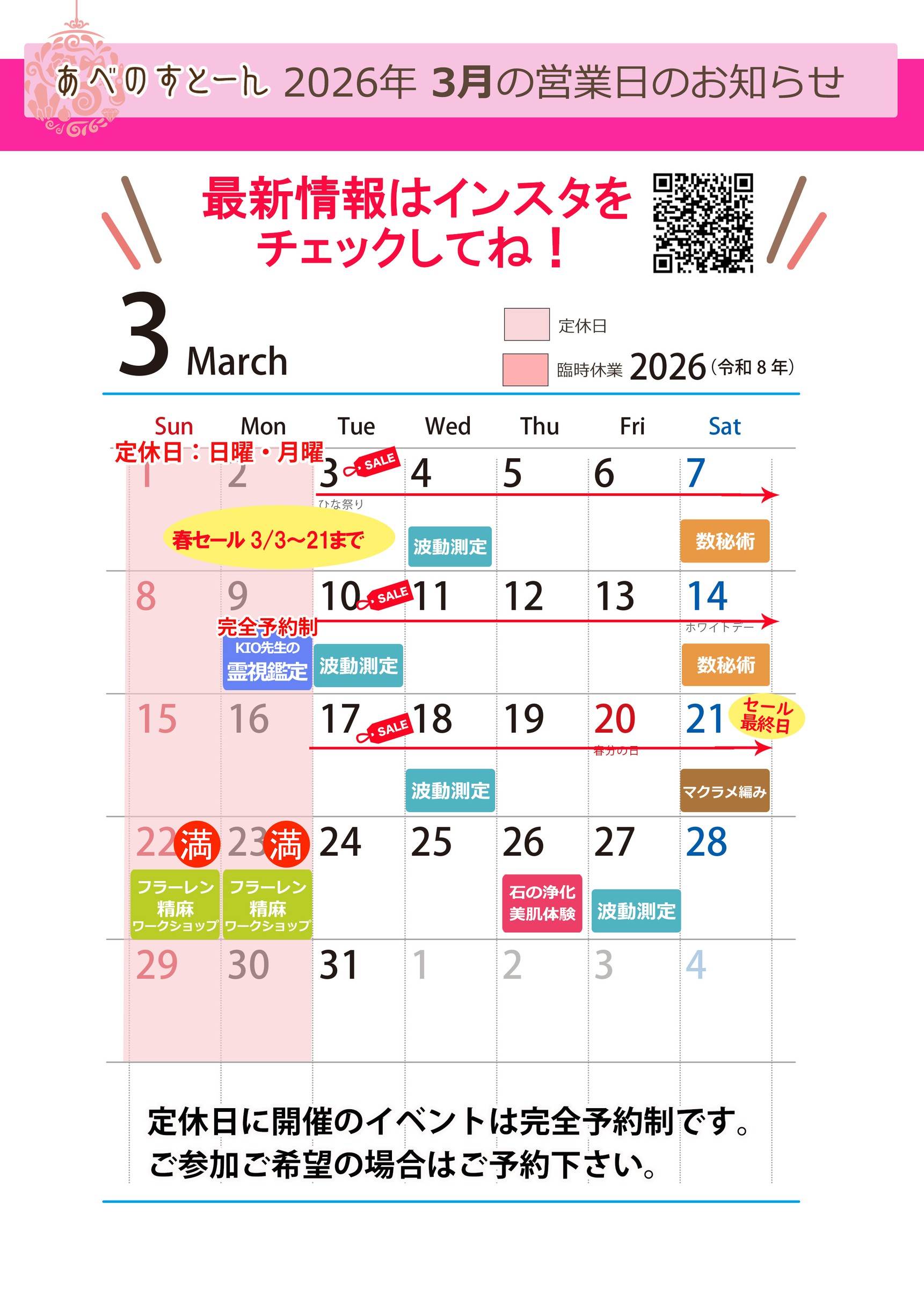 3月のカレンダーです 2026年2月25日 最終更新日時 : 2026年3月3日 kzn_rq_abenostone いつもありがとうございます。 3月は臨時休業はありません。春のセールを開催します。セール:3/3(火)~3/21(土)まで 3月も引き続きよろしくお願いいたします。